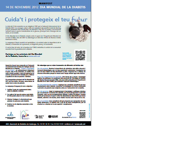 Aquest és el quart any consecutiu on l’educació i la prevenció són les bases de l’eslògan del Dia Mundial de la diabetis, CUIDA’T I PROTEGEIX EL TEU FUTUR, un esdeveniment mitjançant el qual, cada 14 de novembre, es realitza una crida a nivell mundial, a tots els implicats en el control i prevenció de la Diabetis per a millorar la qualitat de vida de pacients i familiars.